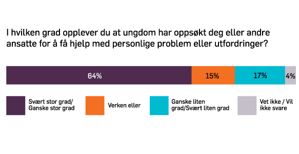 Mer enn 6 av 10 oppgir at ungdom har oppsøkt ansatte på klubben for å få hjelp med personlige problemer eller utfordringer. For veldig mange ungdom er de ansatte på klubb mennesker de kan betro seg til og som de stoler på. Det er særlig utfordringer knyttet til skole, mobbing og konflikter med jevnaldrende, familie- og hjemmesituasjonen og psykisk uhelse ungdommene deler med de ansatte.