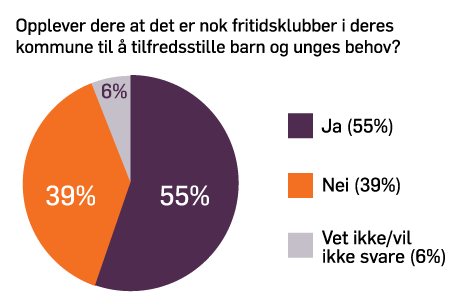 2 av 5 mener at det ikke er nok fritidsklubber i kommunen for å tilfredsstille barn og unges behov. Årsakene skyldes primært spredt bebyggelse og transportutfordringer, men 1 av 4 oppgir også høy pågang av ungdommer. 4 av 10 oppgir at de er avhengige av å søke ekstra tilskudd for å sikre drift. Av klubbene som praktiserer betalt medlemskap skulle 4 av 5 ønske at det ikke var behov for dette. For mer enn 3 av 5 klubber er økonomiske begrensninger årsaken til at de ikke driver med aktiviteter og arrangementer det eksisterer et ønske om å gjennomføre. 7 av 10 oppgir også begrensede personalressurser som en årsak. Den største andelen ansatte på fritidsklubb har prosentstillinger mellom 10-60%. 3 av 5 oppgir at de ønsker at deres ansatte skal få større prosentstillinger.