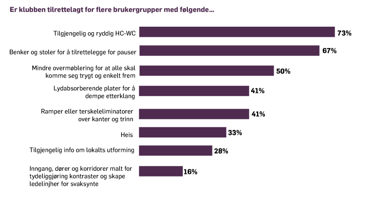 Dersom alle barn og unge skal kunne ha mulighet til å delta i fritidsklubb, må lokalene og informasjonen om tilbudet være universelt utformet. Kun 3% av klubbene oppgir at 1 av 10 deltakere har en funksjonsnedsettelse. Mer enn 6 av 10 fritidsklubber har tilrettelagt for rullestolbrukere og 3 av 10 til en viss grad. 1 av 10 klubber har ikke har tilrettelagt lokaler for rullestolbrukere. Når vi ser nærmere på andre parametere for universell utforming, er det stor spredning i klubblokalenes tilrettelegging. I likhet med undersøkelsen fra 2020 er det dårligst tilrettelagt for svaksynte. Kun 16 % har tilrettelagt lokalene med malt inngang, dører og korridorer for å tydeliggjøre kontraster og skape ledelinjer.