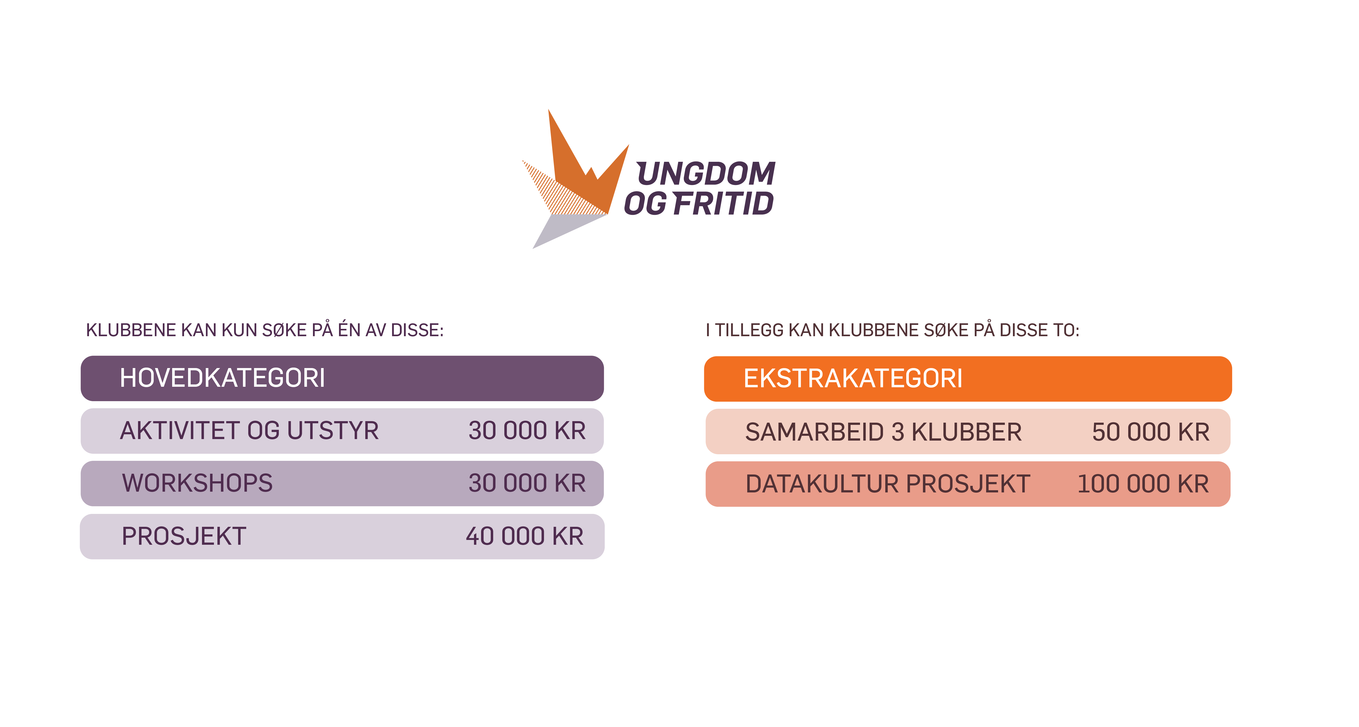 Det meste er likt som før, bare bedre! Vi er glade for å kunne informere om at søknadsbeløpet klubbene kan søke om har økt i alle kategoriene. Samarbeid har er økt med 20.000 kr, de øvrige kategoriene har økt med 10.000 kr. *Dette gjelder kun for de som ikke allerede har sendt inn en søknad på «hovedkategori».